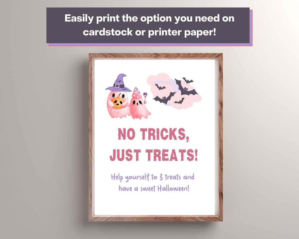 If you're ready to go out on Halloween night with your family but are leaving a bowl of candy on the porch, these trick or treat candy signs are just what you need! Featuring pink Halloween decor, you can download and print this PDF at home.