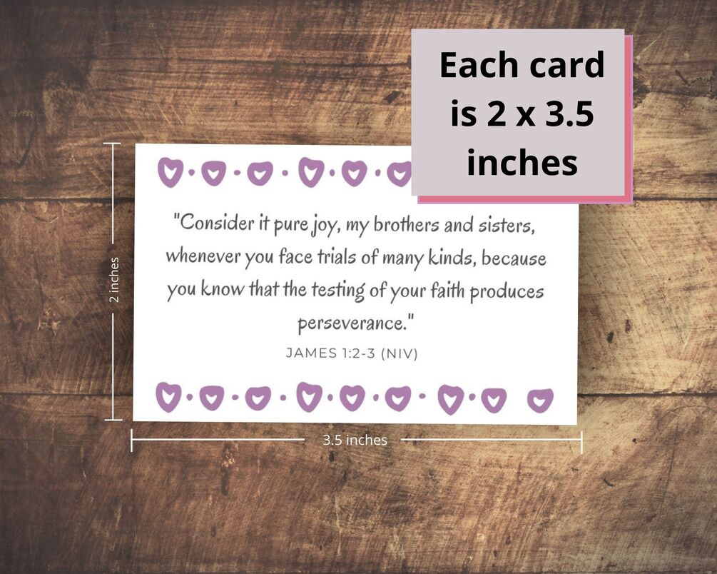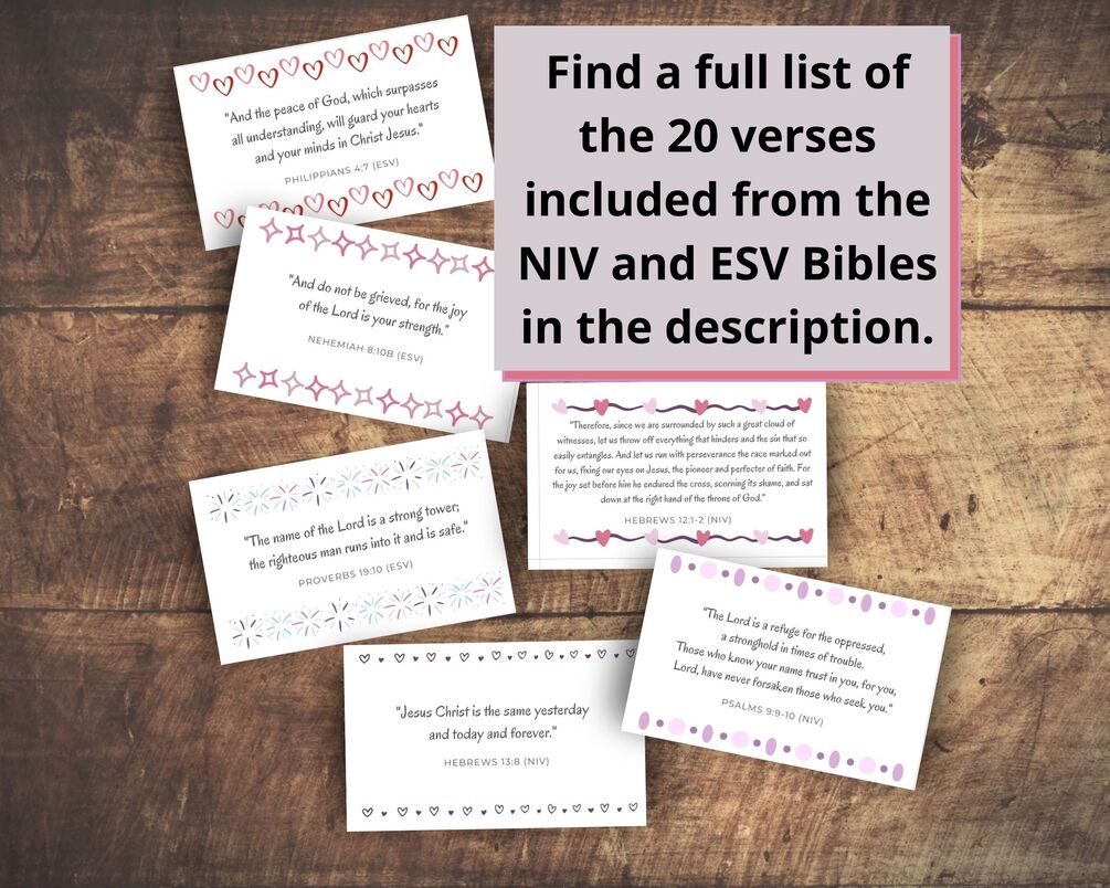 These printable Scripture cards come with 20 encouraging Bible verses taken from the NIV and ESV versions of the Bible.