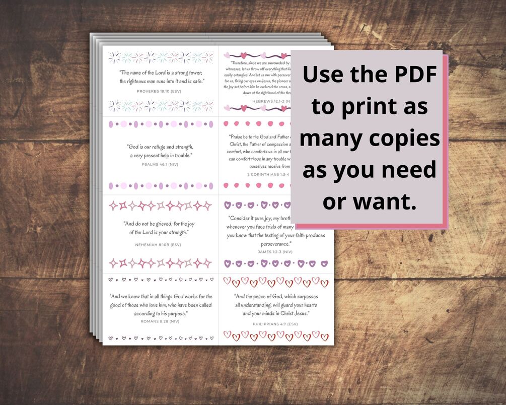 They’re a great pick-me-up when you need encouragement to keep going. Print them out and use them however works best for you. Laminate them and put them on a ring to work on memorizing. Send them along in your tween or teen’s lunchbox. Give them to a friend who is having a hard time. Include a couple in an encouraging note to a family member. Pull one out every morning to give you faith-based encouragement for the day.