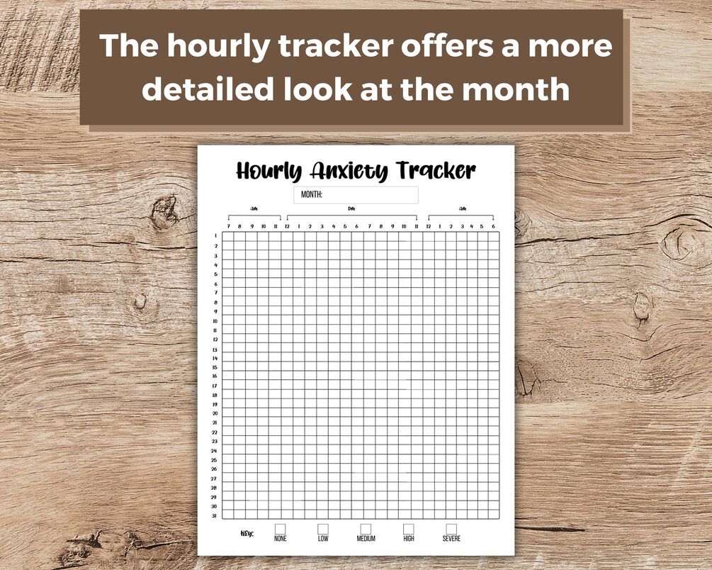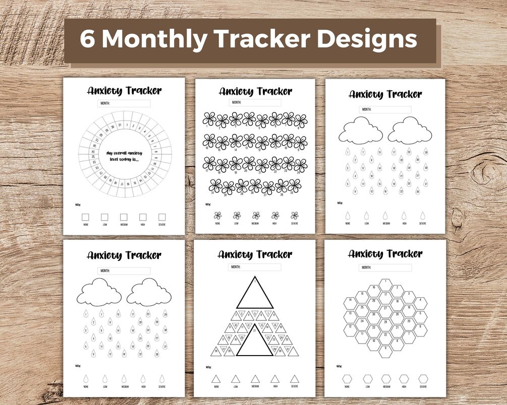 You get 6 monthly tracker layouts that are beautifully designed. You also get an hourly anxiety tracker that allows you a more detailed look at your month. A year anxiety tracker gives you an overview of the entire year and the progress made.