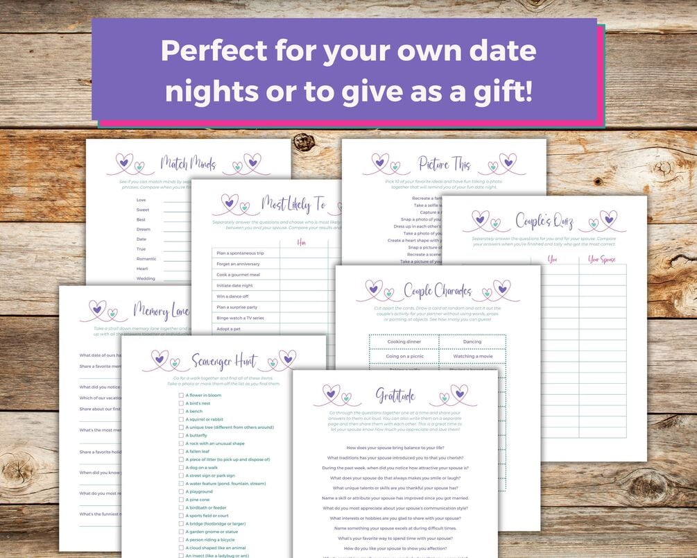 These 15 date night games are a fun way to connect on a date night at home. Put them in a date night box for yourself or give them as a gift! You get the following games: