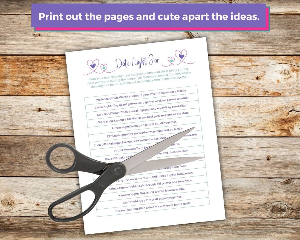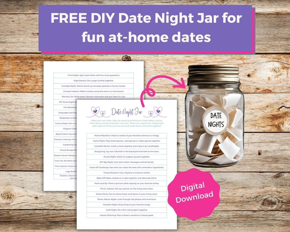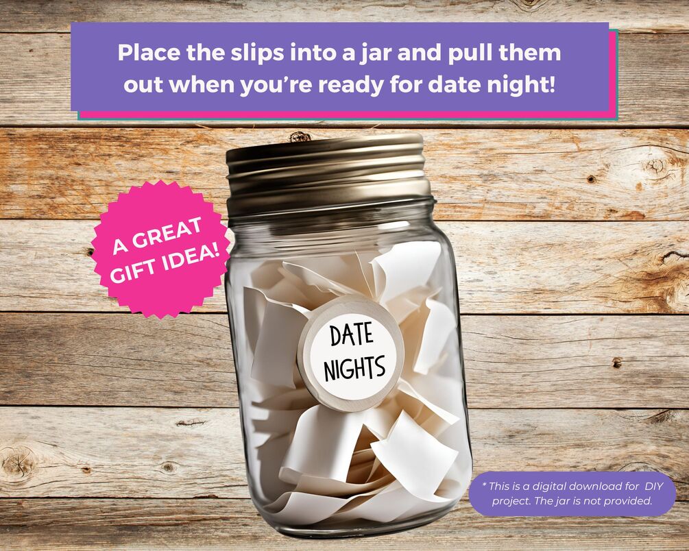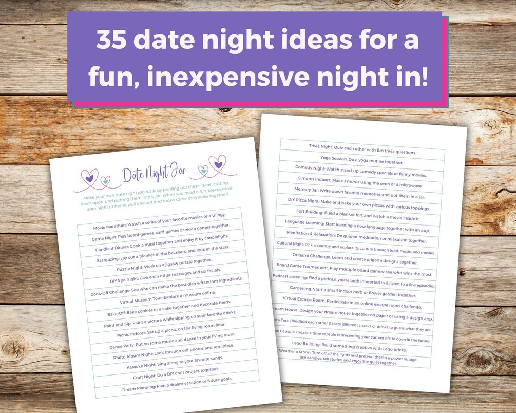 Download these 35 date night idea slips to make your own date night jar. Simply print them out, cut them apart and put them into a jar or envelope to pull out for your next date night.