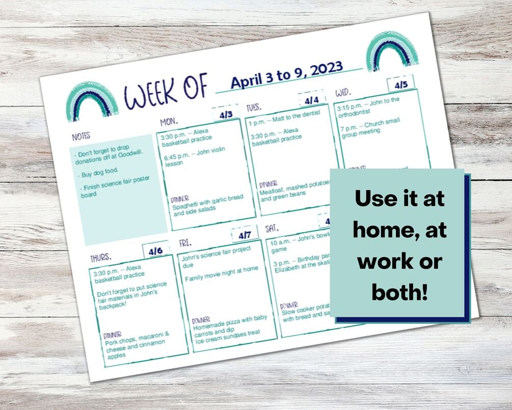 You can use the weekly planner completely digitally, fill it in digitally and print it or print it and write in your notes for the week. Use it for home, work or both! This 7-day weekly planner is undated and works well for whatever you need to organize in your week.