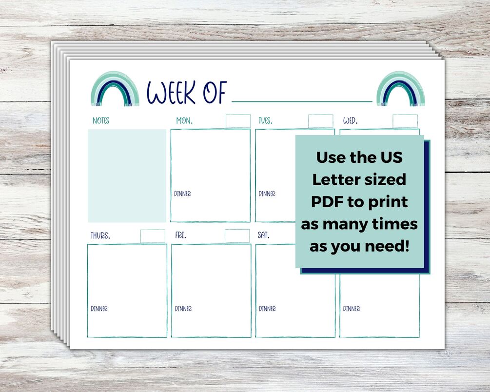 This 7-day weekly undated digital planner is ideal for organizing your week with appointments, notes, dinner ideas and more. Use it weekly to stay on top of things. The editable PDF allows you to reuse it time and again. The page is 11 x 8.5 inches (US Letter).