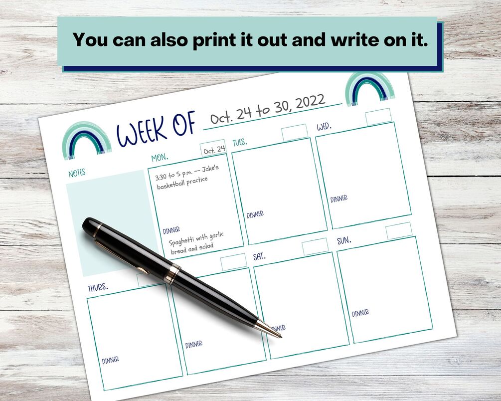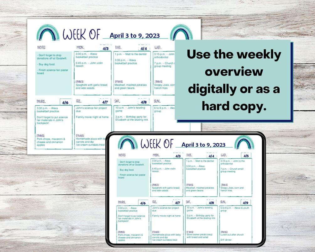 Digital Weekly Family Calendar and Meal Planner Editable PDF with boho rainbow theme