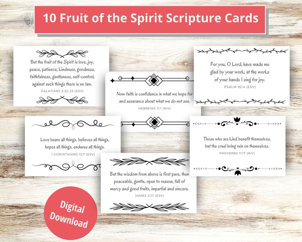 Please note this is a digital download, and no physical item will be sent to you. These Fruit of the Spirit Scripture cards are intended for personal use only and should not be resold in either physical or digital format.