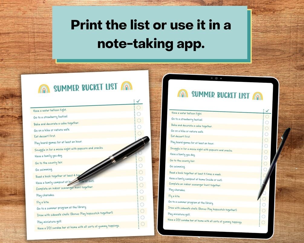 Be intentional with your summer planning this year with this summer bucket list. In both U.S. Letter and A4 sizes, this bucket list is pre-filled with fun summer family activities. Print them out and use them or use them with your favorite note-taking app like GoodNotes.