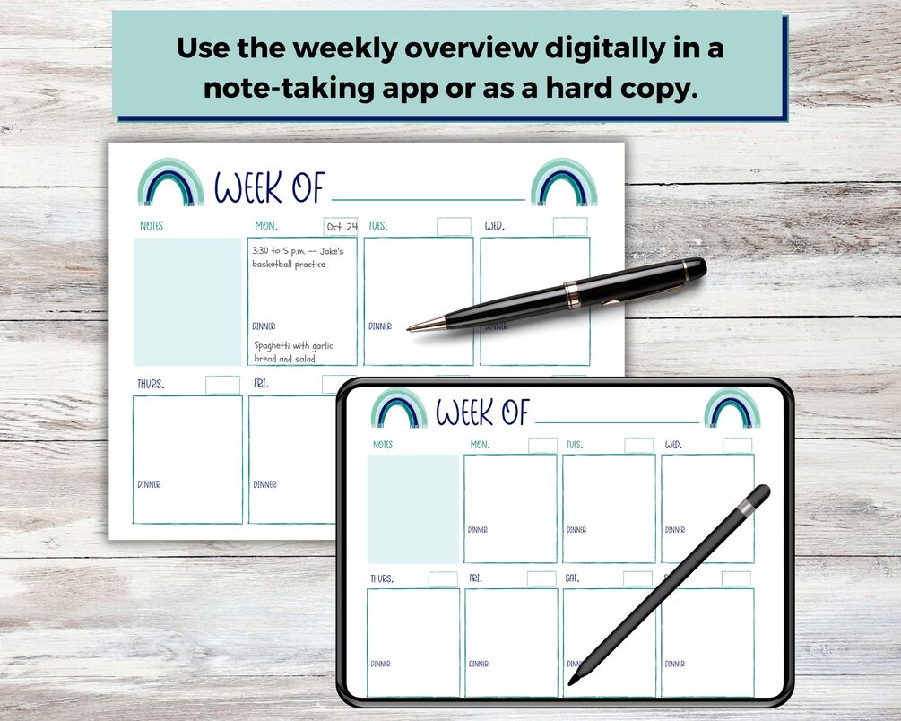 FREE Weekly Family Calendar and Meal Planner with boho rainbow theme