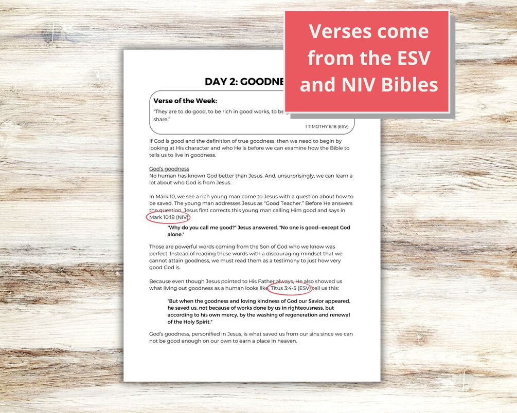 Using Bible verses from both the ESV and NIV translations, the journal takes a loser look at goodness and its role as a Fruit of the Spirit. You'll also find devotional content, commentary, life application insights, thought-provoking reflection questions, a weekly action item and daily prayers to help you grow in your walk with God.