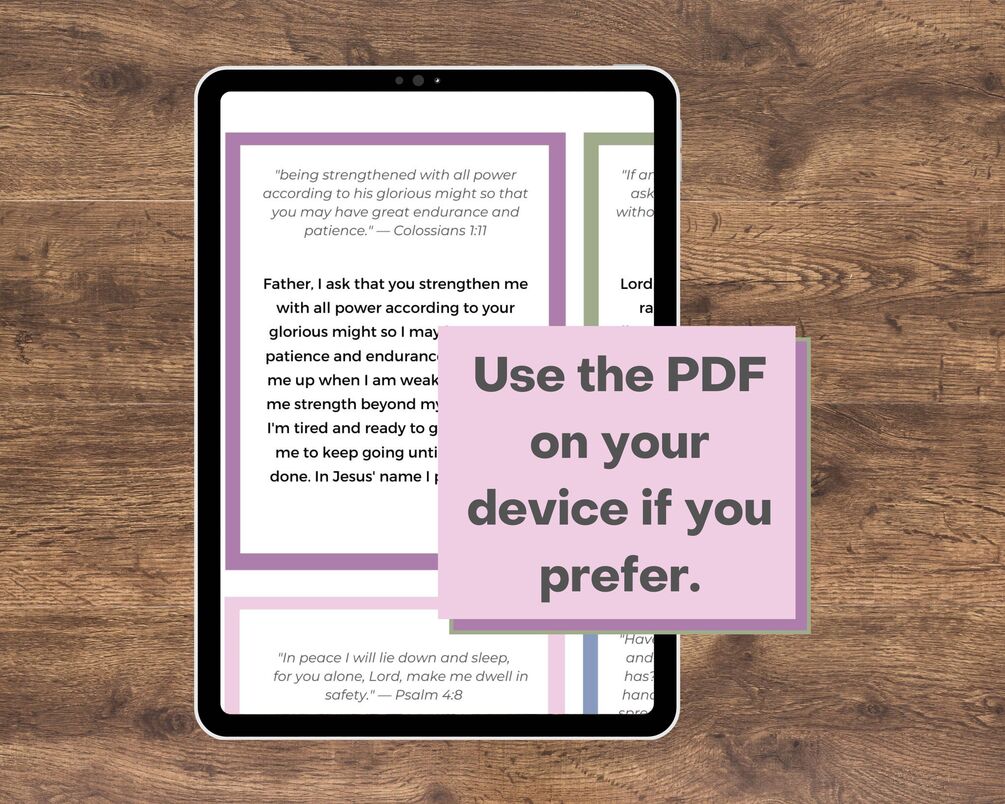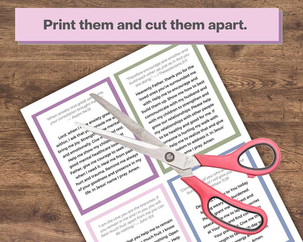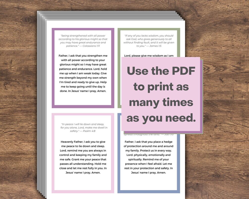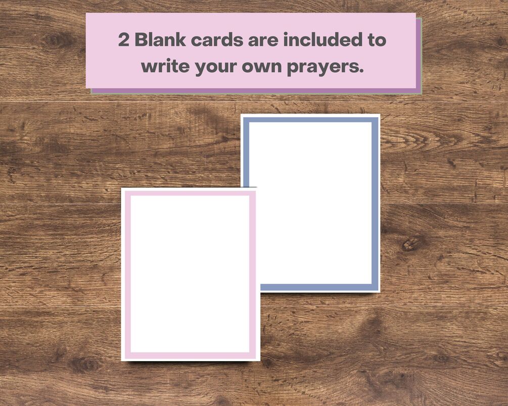 The prayers for moms come with four per 8.5x11-inch page. You can print them out and cut the prayer cards apart or use them in digital form on your device. You get one PDF file with all the pages in it. Two blank cards are also included to write your own prayers.