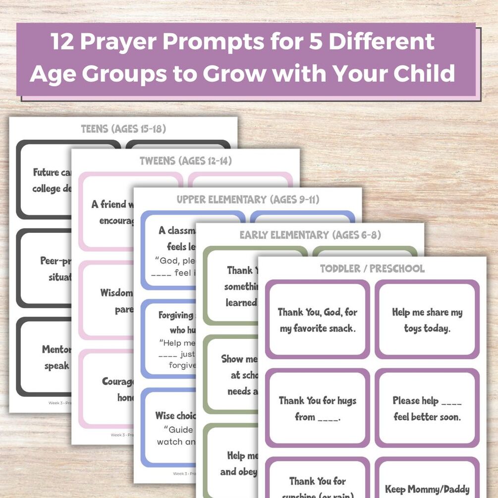 • 60 printable prayer-prompt cards (age decks from toddlers through teens)