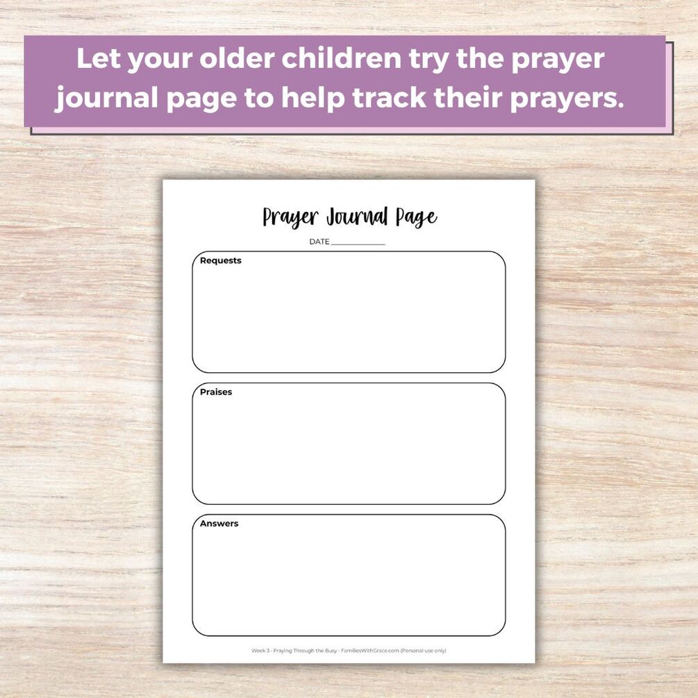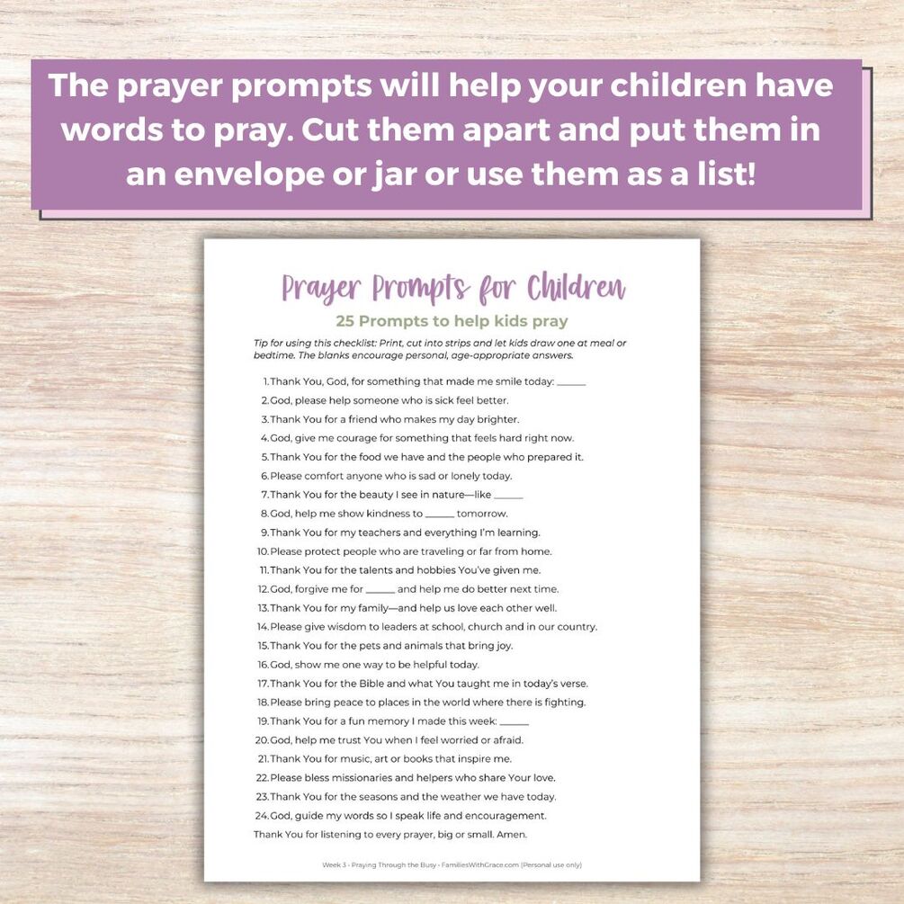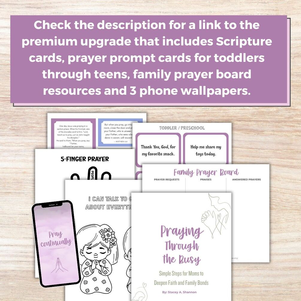 Looking for more? Check out the premium resources that include all of these plus prayer prompt cards, phone wallpapers, Scripture cards and a more in-depth study: https://familieswithgrace.gumroad.com/l/teaching-children-to-pray